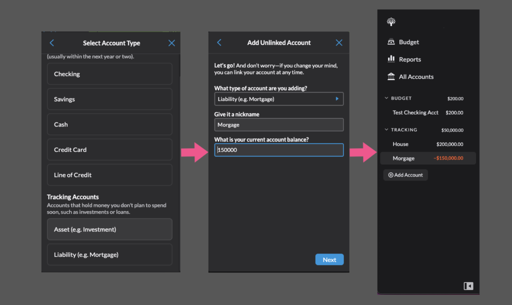 You can also record the cash value of different assets you own, such as a house or investment accounts. Mortgage or personal loans can also be added here. These types of accounts are referred to as “Tracking” accounts. What happens in these accounts doesn’t directly affect your budget, but is still helpful to watch.