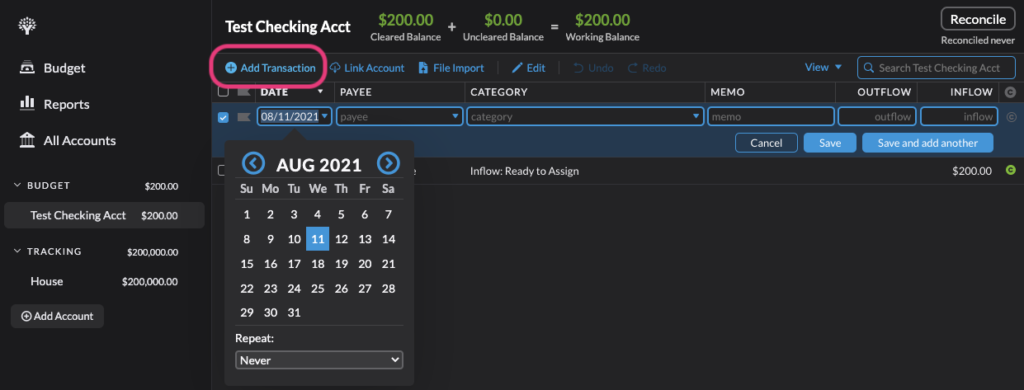 To counteract this, YNAB encourages you to enter your transactions manually when they happen. You can do this by hitting the “+” button at the bottom of the mobile app or hitting the “Add Transaction” button within the web application for the appropriate account.