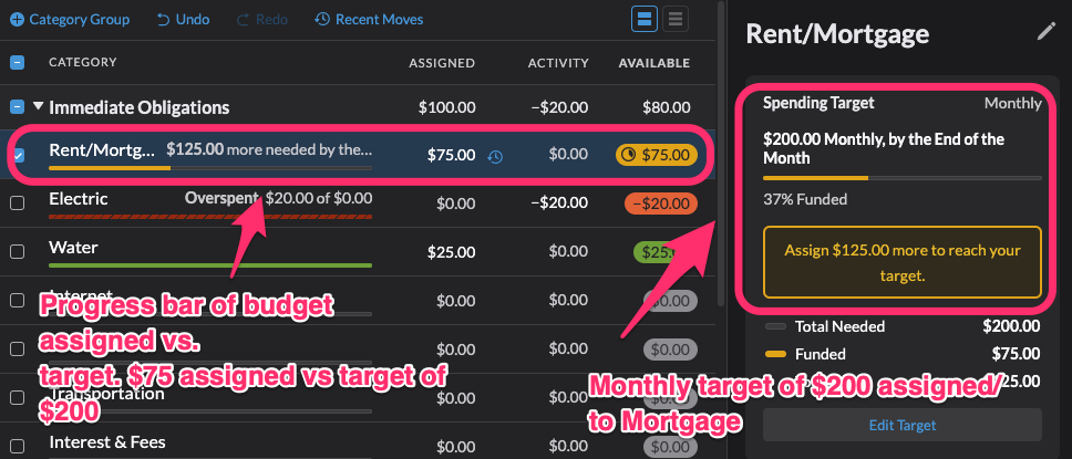 YNAB will then display the Budget you’ve allocated against your Target in a progress bar or pie-chart format.