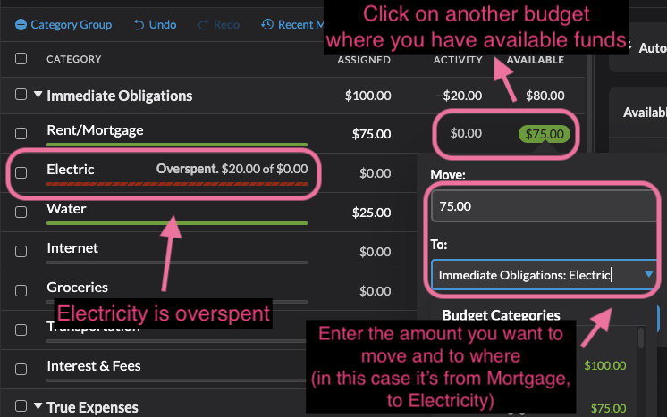 Make sure that when budgeting, ALL dollars are given a job. When you are done budgeting, the “Ready to Assign” section (as screenshotted above), should be $0.